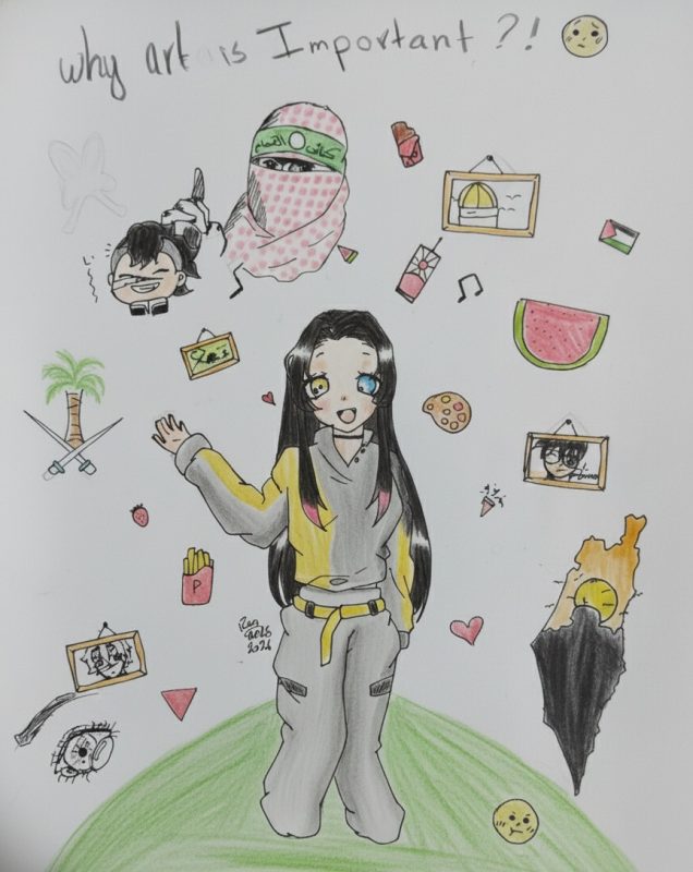 وصف: الرسم هو مزيج من الأفكار والأحداث والتي نرويها عن قصه لأبطالها الأقلام والألوان قلبي يشعر بيدي أرسم موهبتي هنا في صورة لك