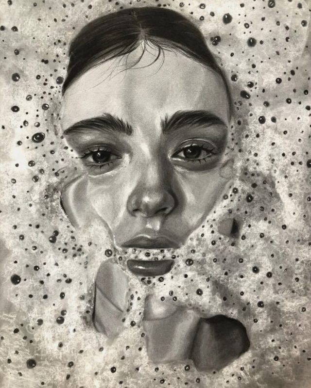 وصف: تتجسّد في هذه اللوحة حالة كتمانٍ طويلة للكلام والشاعر، حتى تتحوّل إلى ثِقل يُشبه الغرق. تتمتع برغوة كثيفة، حيث أنها انعكاس لما تدور في الداخل من خيال متراكب وحديث ملاجىء لم تجد طريقها إلى الخروج أما نظرات العين، فهي لا تسعى إلى تقليصها ولا تبوح بشكوى، بل في منتصف المسافة بين الصمت والاعتراف. ونظرًا لتحملها مرهقًا لا تتحمل الضعف، ولكنها تقول إن بعض الصمت ليس هروبًا، بل تحاول ما تبقى من الداخل. لوحة لا تصوّر الغرق بحدّ كامل، بل اللحظة التي توافق فيها الانغماس الكامل، حين تصبح العجز أثقل من الكلام، وتتحوّل النجاة إلى فكرة معلّقة بين الاحتمالين